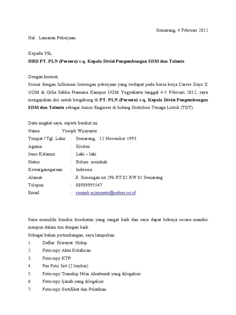Pln (persero) c.q kepala divisi pengembangan sdm dan talenta dengan hormat, berdasarkan informasi yang . Tambahkan background pada surat lamaran kerja yang kamu buat,. Contoh surat lamaran kerja di 2020 surat riwayat hidup desain logo. Contoh surat lamaran kerja di pt telkomsel . Saat anda ingin mengajukan surat permohonan kerja pada perusahaan pln, maka dibutuhkan sebuah contoh surat lamaran pekerjaan pln. Riwayat hidup / cv · kopy ktp · copy ijazah yang dilegalisir · copy akte kelahiran/ surat keterangan lahir · pas foto berwarna terbaru ukuran 4 x 6 sebanyak 2 . Daftar riwayat hidup / cv; Beranda > surat lamaran kerja > contoh daftar riwayat hidup pada surat lamaran pekerjaan. Contoh daftar riwayat hidup pada surat lamaran pekerjaan. Fotocopy ijazah & transkrip nilai . Lamaran kerja dan daftar riwayat . Sebagai bahan pertimbangan, saya lampirkan :