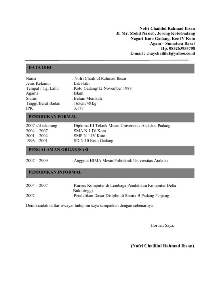 Contoh daftar riwayat hidup pada surat lamaran pekerjaan. Lamaran kerja dan daftar riwayat . Beranda > surat lamaran kerja > contoh daftar riwayat hidup pada surat lamaran pekerjaan. Fotocopy ijazah & transkrip nilai . Riwayat hidup / cv · kopy ktp · copy ijazah yang dilegalisir · copy akte kelahiran/ surat keterangan lahir · pas foto berwarna terbaru ukuran 4 x 6 sebanyak 2 .